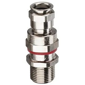La gamme de presse-étoupes ADE 1FC permet le raccordement d'un câble non armé. L'ADE 1FC est disponible en laiton nickelé ou en acier inoxydable 316L, avec un filetage ISO ou NPT. Ce presse-étoupe peut être utilisé pour des applications antidéflagrantes (Ex d) ou à sécurité augmentée (Ex e), en zones poussières (Ex tb) et également dans les mines (groupe I M2). L'étanchéité antidéflagrante est assurée par une résine époxy sur les conducteurs du câble et une bague en silicone sur la gaine extérieure. Un joint de protection déluge renforce l'étanchéité finale de l'ensemble, qui offre une large plage de température d'utilisation de -60 °C à +80 °C.