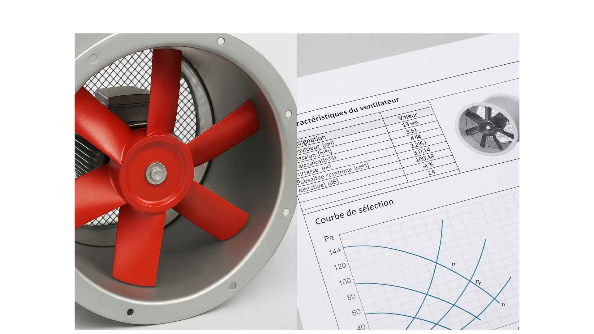 • Caractéristiques de performance : débit d’air, pression statique et totale, vitesse de rotation.