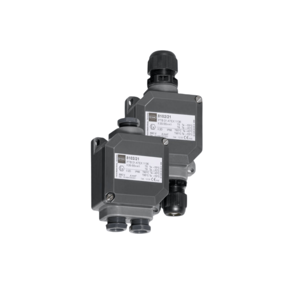 Le scatole di bypass della serie 8102 sono ridotte EX E E E-tube progettate per distribuire energia elettrica nelle zone ATEX. Sono realizzati in resina poliestere rinforzati con fibra di vetro e quindi estremamente robusta. La casella Bypass è dotata di 5 terminali della camicia, uno dei quali viene utilizzato come connessione PE. La gamma di serraggio dei terminali della camicia è 2 x 4 mm².