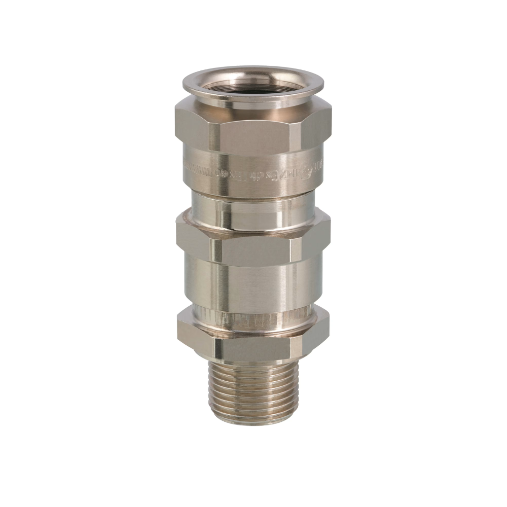 La gamme de presse-étoupes ADE 5F permet le raccordement d'un câble armé par feuillard, fil ou tresse. L'ADE 5F est disponible en laiton nickelé ou en acier inoxydable 316L, avec un filetage ISO ou NPT. Ce presse-étoupe peut être utilisé pour des applications antidéflagrantes (Ex d) ou à sécurité augmentée (Ex e), en zones poussières (Ex tb) et également dans les mines (groupe I M2). L'étanchéité antidéflagrante est assurée par une bague en silicone sur la gaine intérieure du câble, complétée par une deuxième bague en silicone sur la gaine extérieure du câble. L'ancrage a une fonction anti-rotation, il est simple à mettre en oeuvre, inspectable et compatible avec tous les types d'armure, pour assurer efficacement la continuité vers la terre. La plage de température d'utilisation est de -60 °C à +140 °C. Pour un câble avec gaine plomb, prévoir une rondelle de continuité (à commander en accessoire). En option, un joint de protection déluge permet de renforcer l'étanchéité finale de l'ensemble pour les tailles 12 à 17.