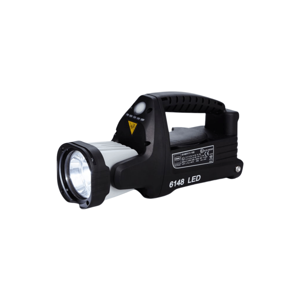 Le projecteur portatif à LED 6148 permet une utilisation ergonomique d'une seule main, et peut être gradué en continu ou commuté en mode clignotant. La tête de projecteur orientable dirige le faisceau lumineux dans presque toutes les directions. Des diffuseurs colorés font du projecteur un luminaire de signalisation Ex mobile. Il est homologué pour une utilisation dans des véhicules et remplit une fonction d'éclairage de secours en tant qu'unité avec le support chargeur. Technique à LED assurant une faible consommation d'énergie et une forte intensité lumineuse Homologuée selon la norme pompiers Tête de lampe orientable sur 190° Poids extrêmement réduit Luminosité graduable en continu pour lumière principale Longue autonomie de batterie Utilisation ergonomique d'une seule main